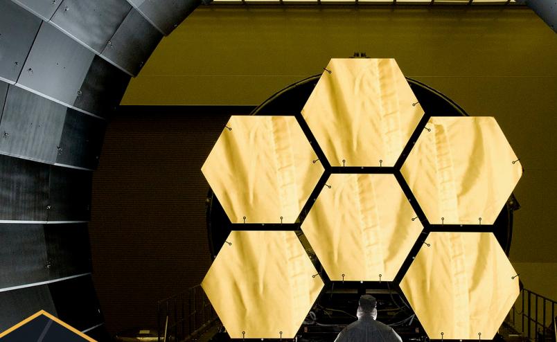 比如为了观测数十亿光年之外的星体,探测到它们发射过来残留的极其微弱的红外线,望远镜必须有一个巨大的反射镜,但为了能够放在火箭负载里发射上天,不得不分割成18个六边形的小镜片,到了太空里再呈蜂窝状展开到大约6.5米的直径。