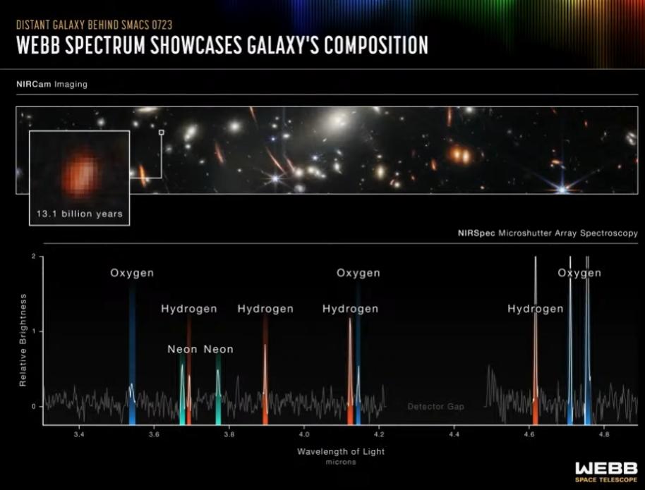 不仅如此,如果你放大这张照片,仔细查看下图中暗红色的天体:科学的红外观测结果认为,这个天体所产生的光,经过了大约131亿年左右才被韦伯望远镜拍摄到,形成这样一个暗红色的光斑。