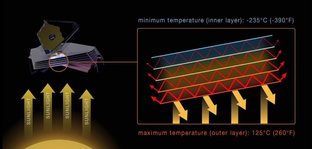 这种结构的隔温效果极好,即使在对着太阳的一面达到125度,靠近望远镜本体的这一面仍然能够维持在-235℃。