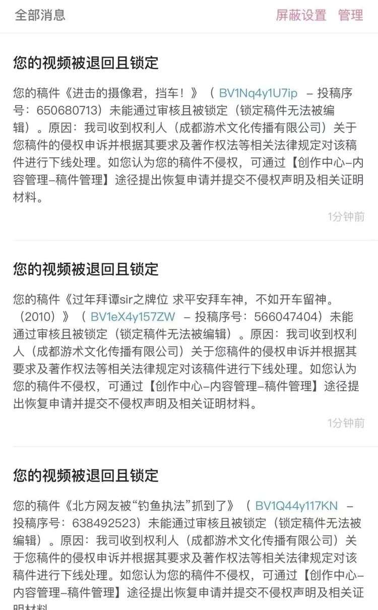 B站up主晒出的视频退回通知,投诉人均为游术公司
