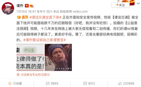 “成都电视台真是丢脸丢大了,想要钱直接说不就行了,又想拿钱,又要立牌坊,真是服了。”获得了13421个赞;“离了个大谱!前有李子柒,后有谭乔谭警官, 这上哪说理去?声援谭警官!!!”获得了8158个赞;“@刑法学人罗翔,快来救场”获得了3449个赞;“公益普法视频都有资本敢动手?小心成为下一个视频的素材。”获得了2918个赞。