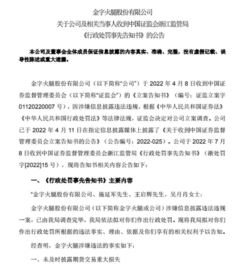 金字火腿7月10日晚间发公告称,公司及相关当事人已于7月8日收到浙江证监局《行政处罚事先告知书》。告知书显示,金字火腿因未及时披露期货交易重大损失、未及时披露收到大额赔偿款,构成违规违法行为,浙江证监局拟决定对其责令改正,给予警告,并处以50万元罚款,对公司时任董事长施延军等多名高管给予警告并分别处以20万元罚款。