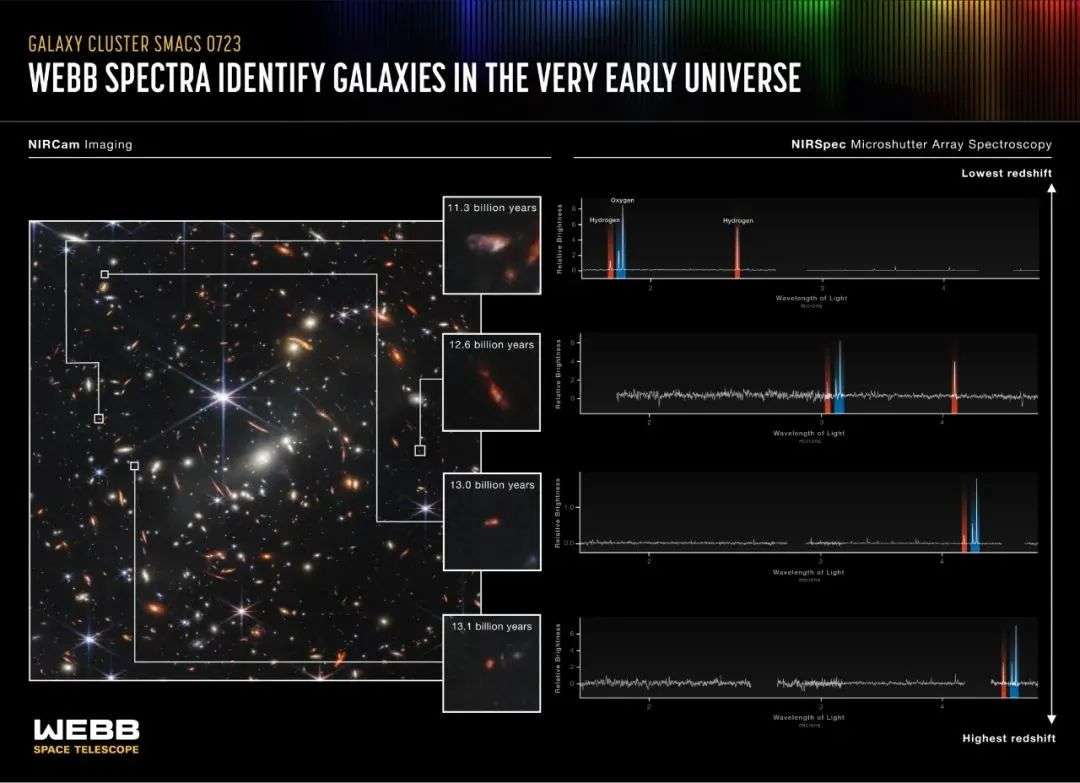 星系团 SMACS 0723 部分背景星系的特征谱,它们距离我们都超过100亿光年 | NASA/ESA/CSA/STScI
