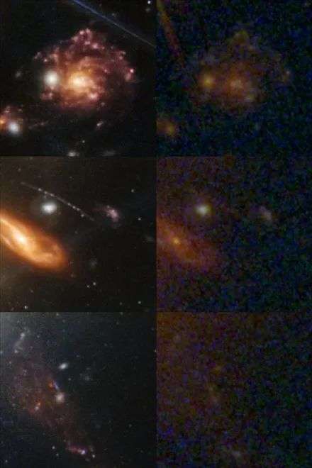 上图细节(左排)与哈勃望远镜拍摄同一天区(右排)的对比 | NASA/ESA/CSA/STScI/c_victor_astro