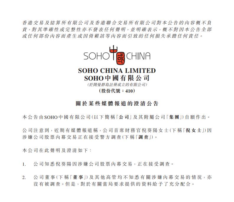 SOHO在公告中强调“公司董事及其他高管均不知悉有关涉嫌内幕交易的情况,亦没有被调查。但是,对于有关当局要求提供的资料给予了充分配合。”