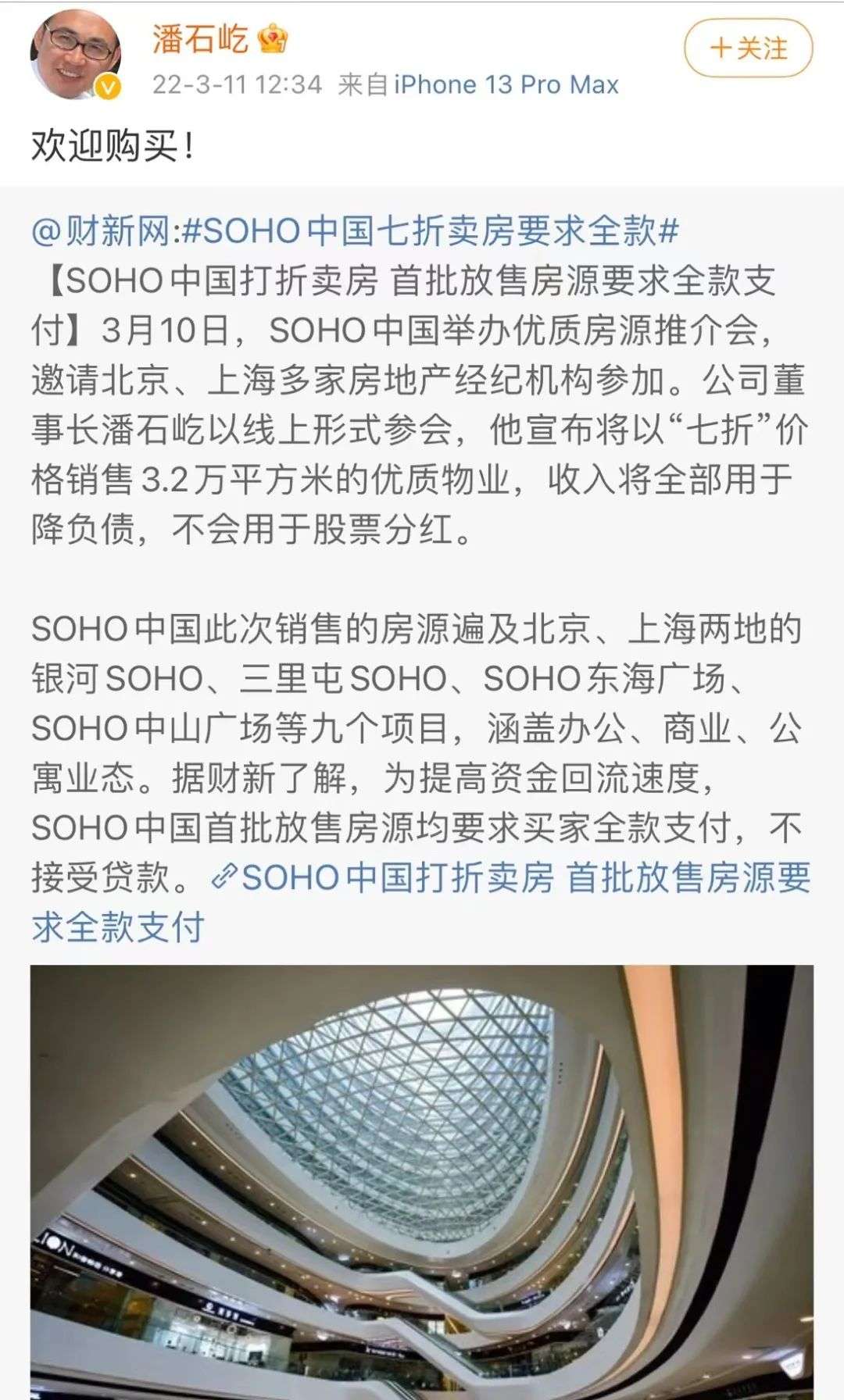 更夸张的是,潘石屹卖房的决心:这批房产,SOHO中国打算按照市场估值的七折出售!