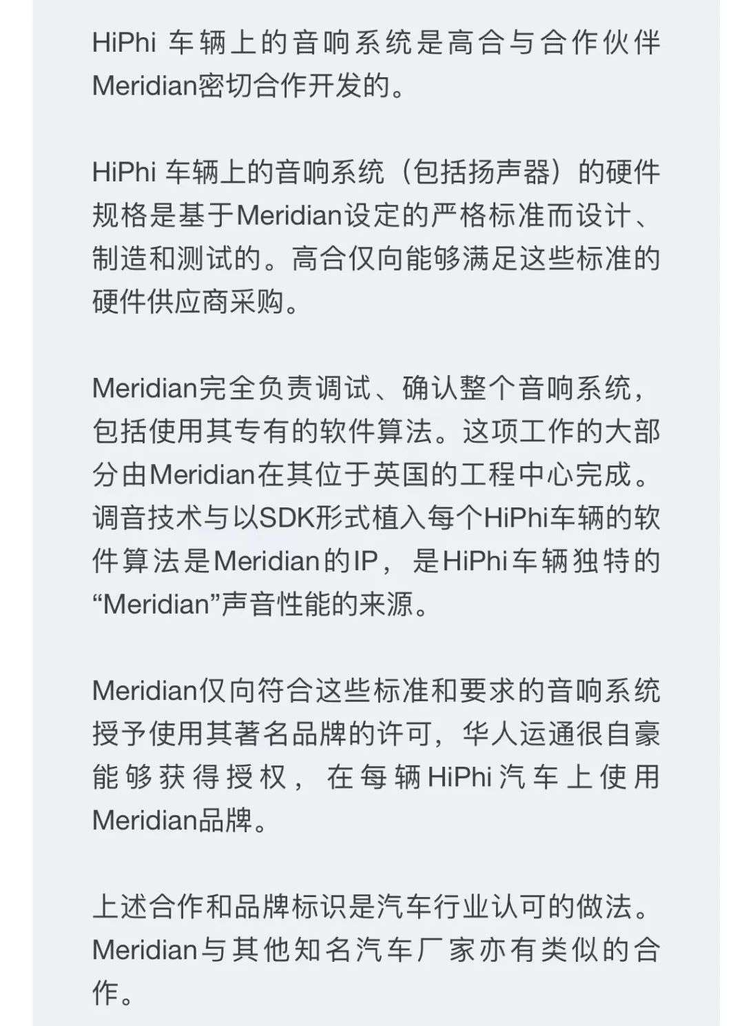 上述上海芭洛电子科技有限公司员工认为:“高合有点冤。它明明获得了英国Meridian的授权,使用贴着Meridian品牌的音响系统,没有任何问题。Meridian自身不出喇叭单元,当然是找专业喇叭厂代工的。汽车音响是一个系统,Meridian对这个系统的效果负责。”