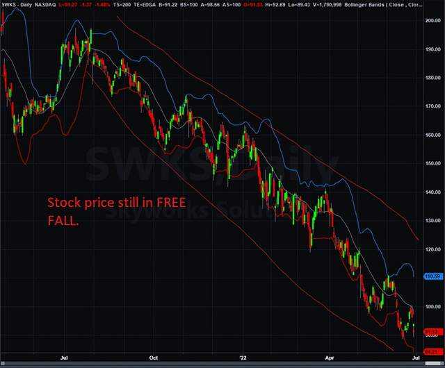 在这种环境下购买是有风险的,而且是巨大的风险。一种可能的方法是等待8月初的财报,然后观察市场的反应。对实力的看涨反应可能是开始新头寸的好地方。很明显的是,这只股票在技术上受到了冲击,当这种情况发生变化时,向上的移动将是强劲的。管理层预计Skyworks会增长,但经济衰退伴随客户疲软可能会将其实际增长推迟一到两年。底部在哪里,何时买入成为了一个问题?在财报公布后股市出现强劲反应可能是一个好时机。