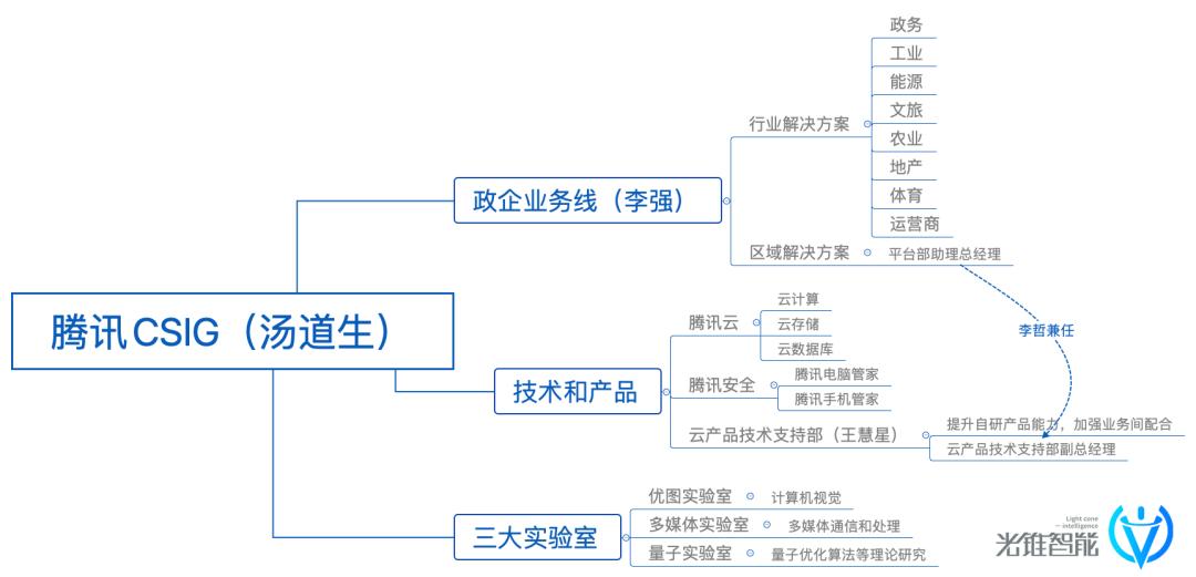 组织架构方面,新成立政企业务线, 包括政务、工业、能源、文旅、农业、地产、体育、运营商等领域,由腾讯公司副总裁李强出任政企业务线总裁,全面负责行业团队管理和区域业务拓展。另外, CSIG还单独成立云产品技术支持部, 负责协助云基础产品的方案拉通和深度支持工作。
