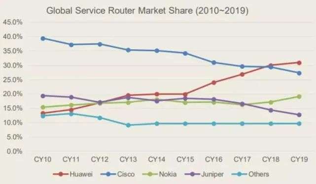 2000年之后,情况变了。Juniper、华为迅速崛起,开始挑战思科的地位。