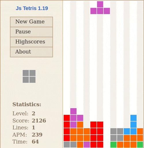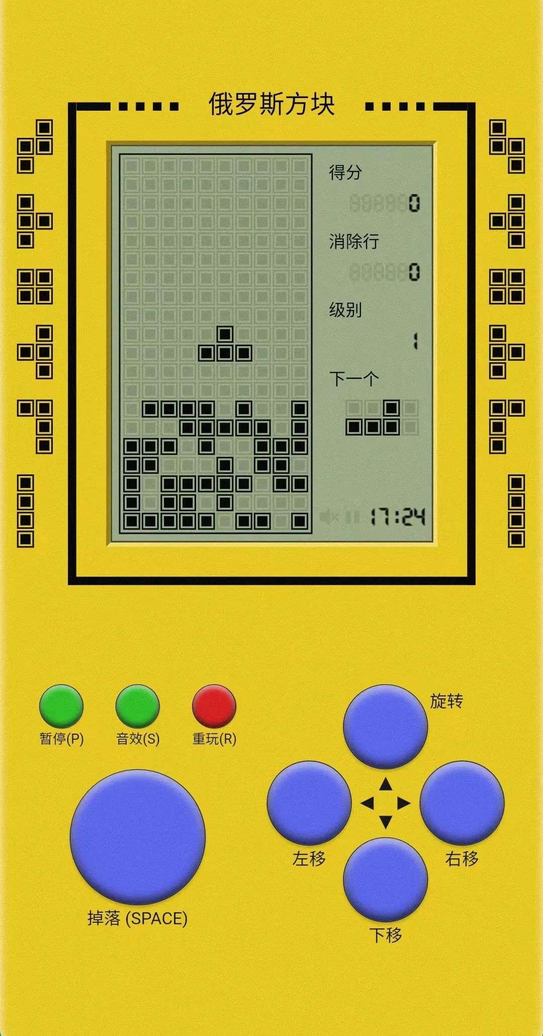 这个游戏操作非常简单,仅需下、左、右、旋转4个按键控制屏幕上下落的7种4格方块,当这些方块下落填满一整行的时候就会消除此行,消除行数越多,得分就越高。