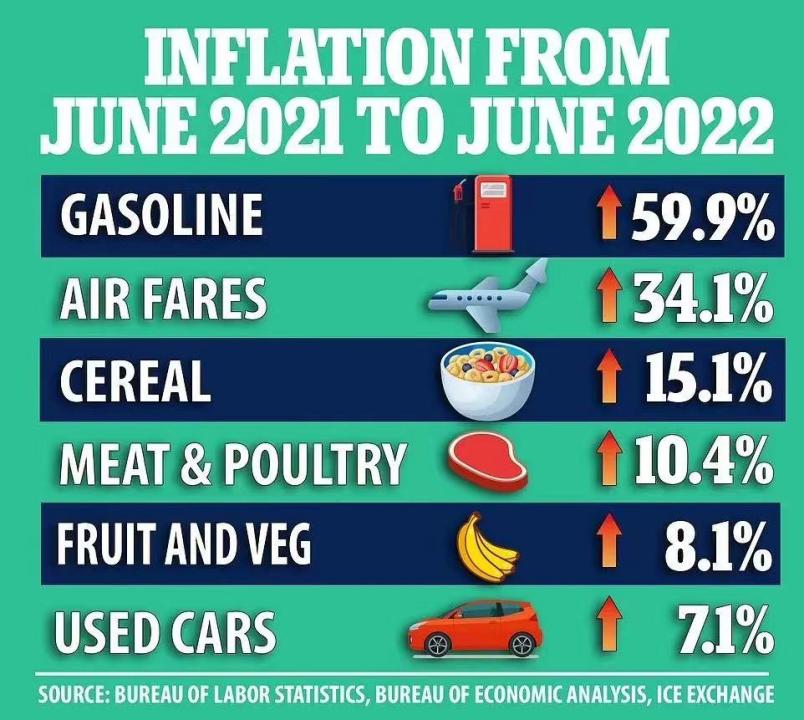 根据最新公布的通胀指数显示,与去年6月相比,美国的汽油价格上涨了59.9%,飞机票上涨了34.1%,早餐上涨了15.1%,肉类上涨了10.4%,水果上涨了8.1%,二手车上涨了7.1%。而这一切,都是建立在从去年开始不断上涨的基础上,从未停过。