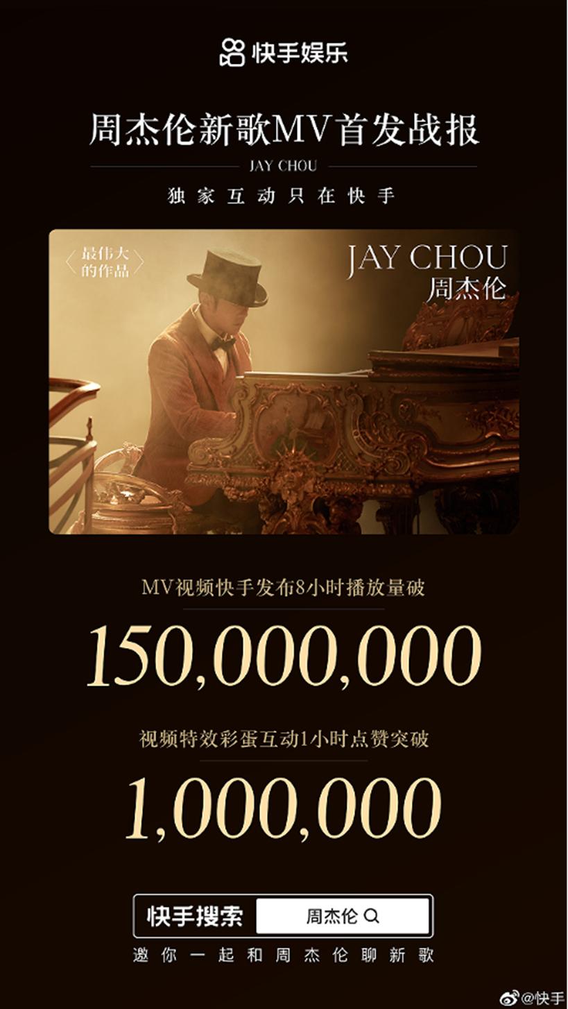 先行曲MV发布当日,不少歌迷在各大APP之间反复横跳。与其他平台上以杰威尔音乐名义开通的官方账号相比,快手是周杰伦唯一入驻的中文社交平台,目前粉丝数已突破3360万。此次新专辑先行曲MV由周杰伦在其快手账号“周同学”亲自上线发布,数据显示,发布1个小时,视频点赞量破百万,上线3小时,点赞量超250万,8小时播放量突破1.5亿。