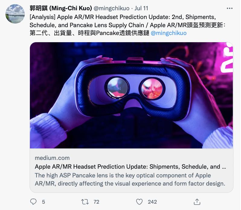 有意思的是,就在第二天,「苹果专属爆料师」郭明錤给出了关于苹果 AR/MR 头显的最新预测,称苹果预计 2025 或者 2026 年将发售第二代头显,届时出货量将达到 1000 万台。