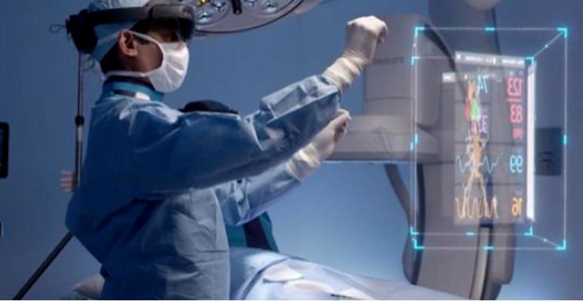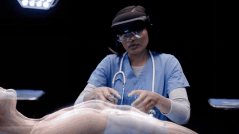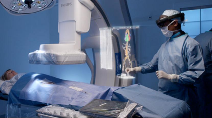 在手术过程中,外科医生使用头显设备,可以看到影像视图以交互式全息图的形式叠加在患者现实中相对应的身体部位上。