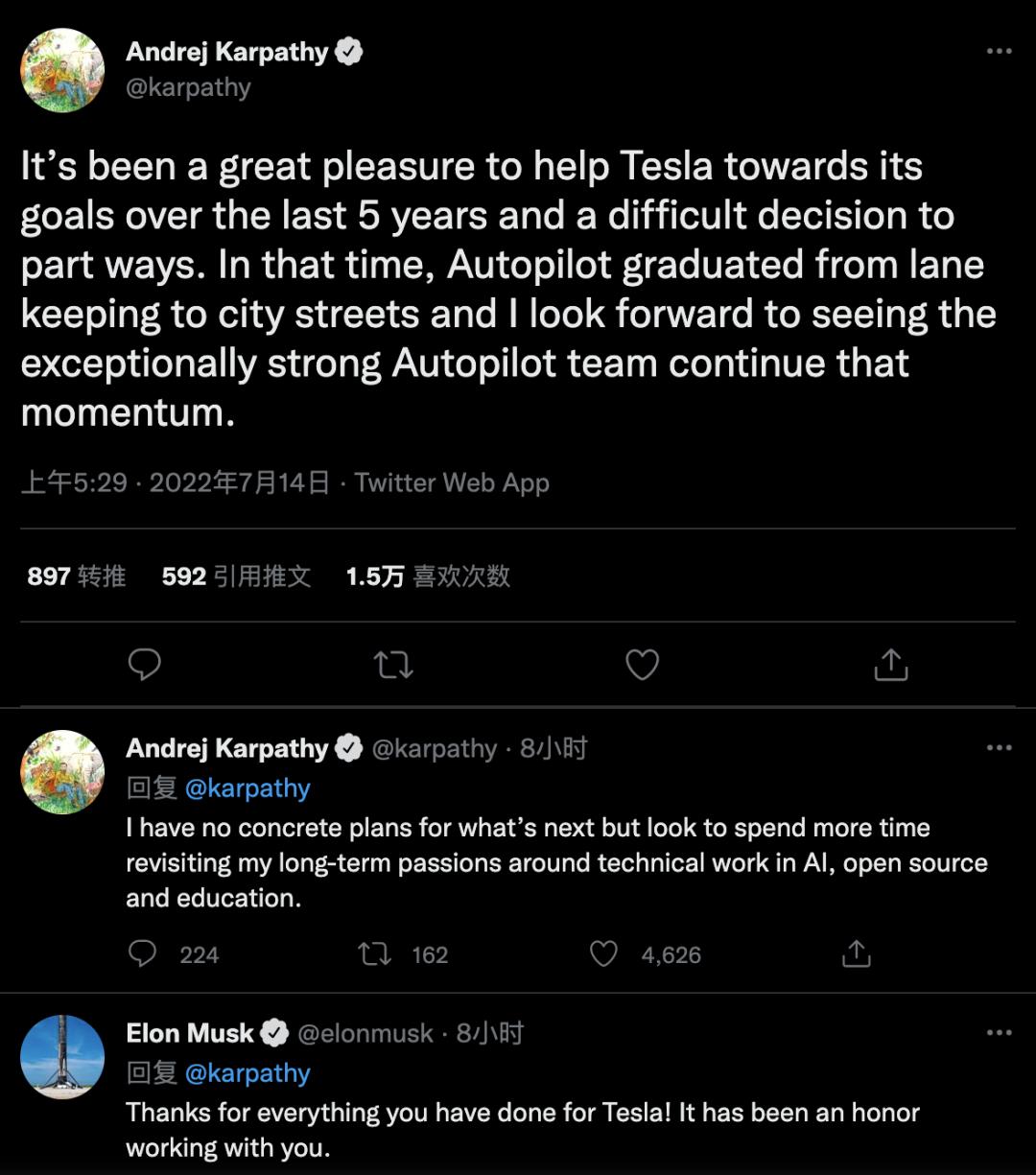 特斯拉CEO埃隆·马斯克在推特上罕见地回应了Karpathy的离开,“感谢Karpathy 为特斯拉所做的一切”,并表示与其合作共事是他的 荣幸。