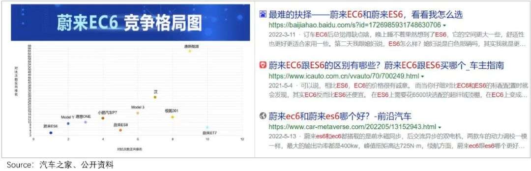 据汽车之家大数据,蔚来EC6的的竞品车系,位列Top 3的分别为蔚来ES6、Model Y、理想ONE。