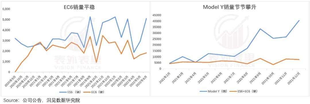 在Model Y“降维冲击”以及自身“内讧”下,ES6和EC6的销量爬坡趋势,逐渐放缓,特别是EC6,交付3个月后即爬坡趋势不再,销量一直徘徊在2000辆左右。