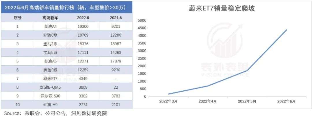 蔚来的首款轿车ET7,在今年3月开始交付。且交付以来,销量持续爬坡中,6月的销量更是进入了高端轿车销量TOP10。