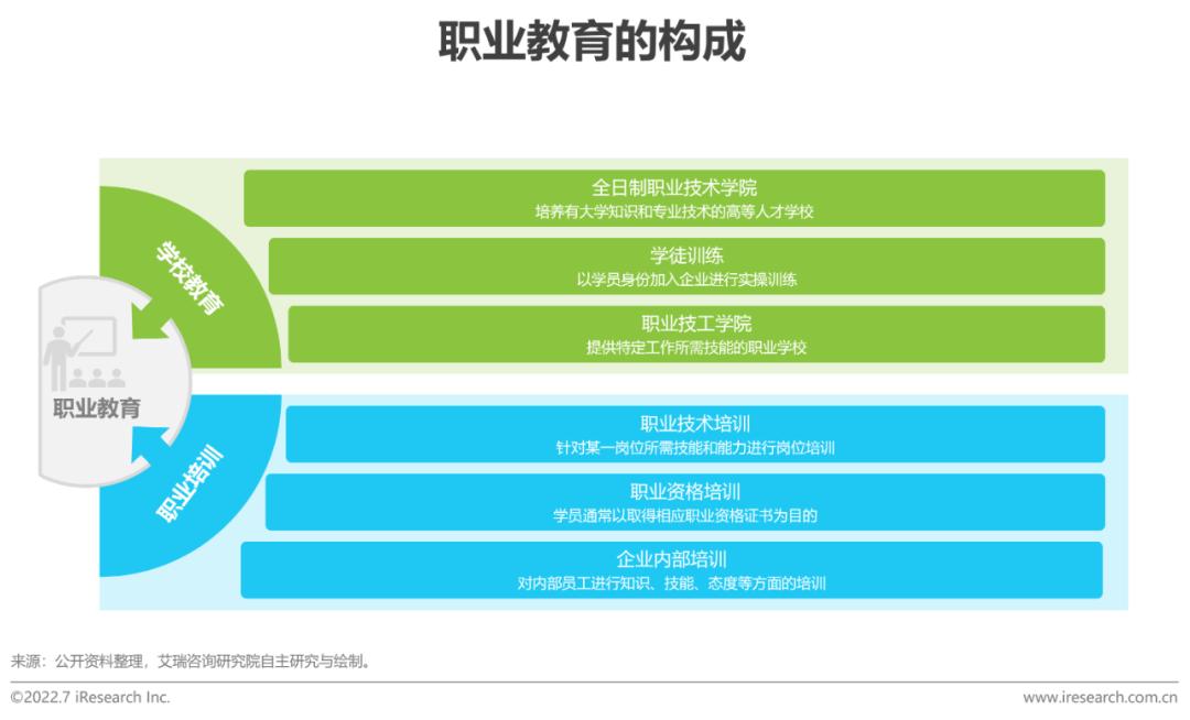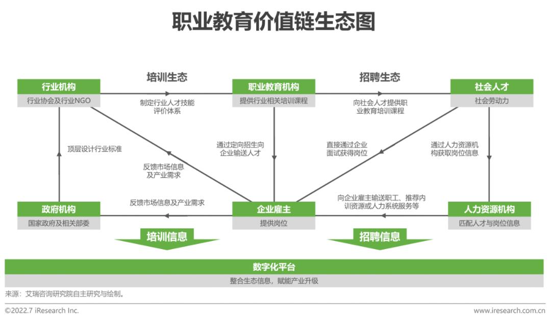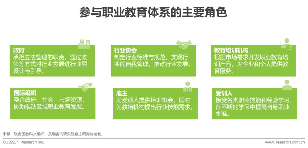 职业教育是职业学校教育与职业培训组成的有机整体,行业参与者除教育培训机构与受训学生外,还涉及企业雇主、行业协会、政府等多方,各群体共同构成密不可分的产业生态。