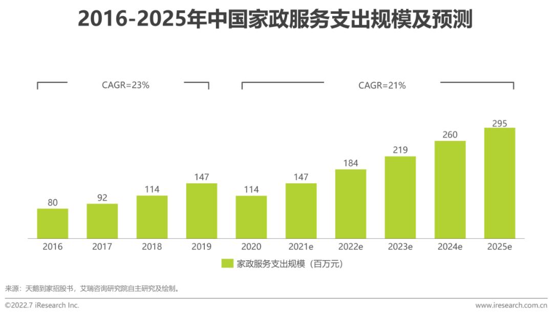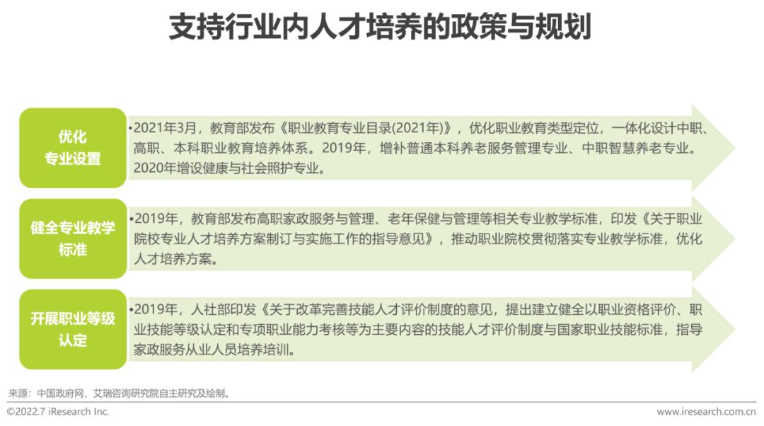 家政服务是朝阳产业,民生产业。商务部数据显示,“十三五”时期,我国家政服务业营业收入年均增速超20%。该行业对直接服务民生,对扩大就业、提高城乡生活水平、拉动内需、促进社会和谐具有重要意义。随着人民生活水平不断提高、老龄化程度不断加深、三孩生育等政策实施,预计我国未来家政服务支出规模将持续扩大。据商务部测算,2021年我国家政服务业从业人数超过3000万,全行业服务缺口在2000万人以上。截至2020年底,全国累吸纳85万贫困地区劳动力从事家政服务,需要接受职业培训的家政从业者数量较多。为了提供高效专业的服务,促进行业规范发展,国家开展系列政策部署规划,紧跟家政服务行业的新发展,指导家政服务从业人员培训,行业内职业教育与培训市场前景广阔。