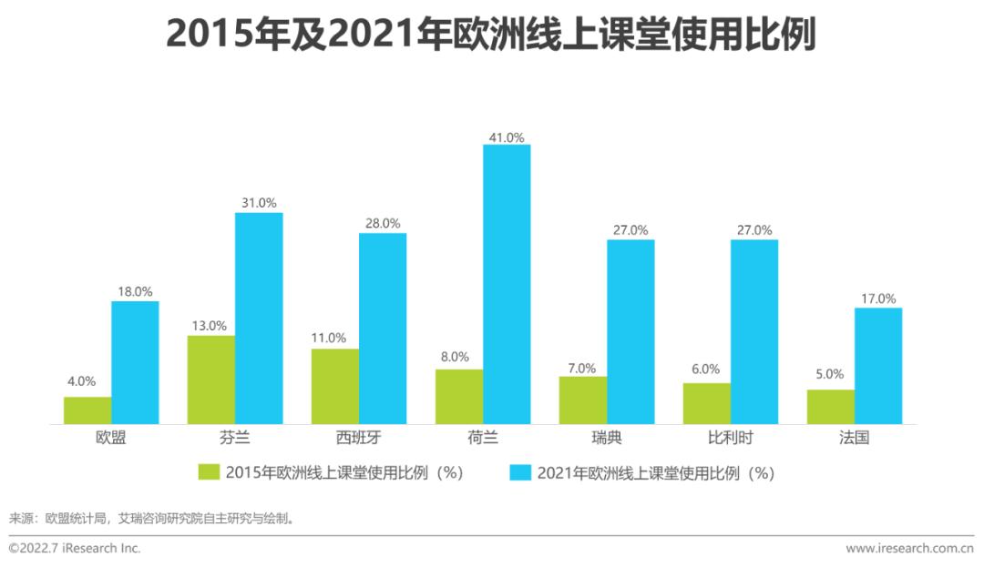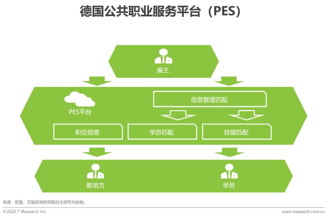 据欧盟统计局统计,2021年欧洲在线课堂使用比例较六年前得到显著提升。疫情是短期内推动渗透率上升的第一大因素,在此背景下,欧洲职业教育的网络化和数字化体系也得以建立。例如德国建立的公共职业服务平台(German Public Employment Services),雇主可以直接在平台上发布用工信息,经后台处理后将技能需求等传递到教培方和学员,从而提升三方之间的匹配效率,并从产业层面降低劳动力供需错配。