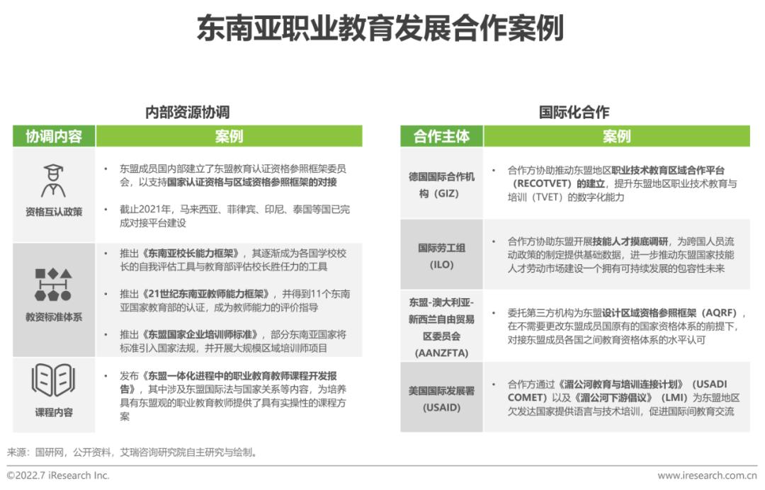 随着东南亚经济的逐步发展,各国对职业教育的重视程度与专业人才的需求度均在提升,但由于东盟大多数国家的职业教育体系仍处于起步阶段,在政策监管、行业标准、课程体系等各方面均有较大提升空间,因此通过推动东盟内部各国的资源协调与外部的国际化合作,进一步加强职业教育发展交流,引入各方职业教育先进成熟经验,有效促进东南亚职业教育发展。