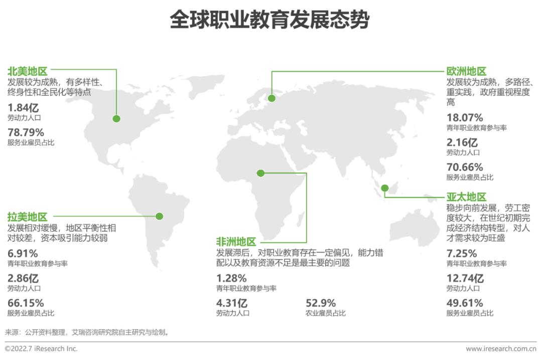 不同的生产力发展水平决定了不同的世界市场经济发展状况,职业教育渗透各行各业,发展程度与本国人口结构、经济结构与产业发展息息相关。欧美地区职业教育发展相对成熟,多年的发展和迭代演进出相对完善的职业教育体系及教育模式;亚非拉地区发展仍在相对起步的阶段,各地区正在积极探索符合自身人才发展需求的职业教育体系。