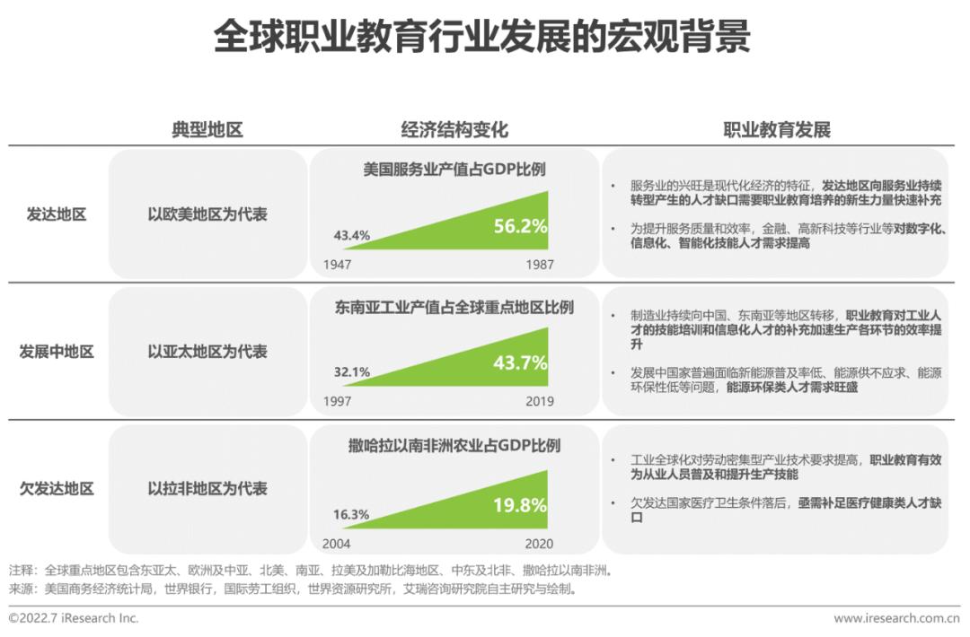 全球各地区因自身发展程度不同,拥有的产业比例也不尽相同,随着近年工业化、信息化浪潮的席卷而来,全球产业格局发生转变,产业人才需要持续精进自身以适应不断变化的环境,这也为职业教育的全球化发展提供了肥沃的土壤。