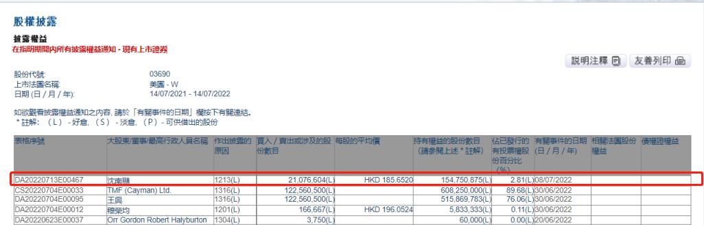 36氪获悉,港交所权益披露资料显示,7月8日,红杉中国减持约2107万股美团股票,价值约39亿港元,持股比例由3.19%下降到2.81%。