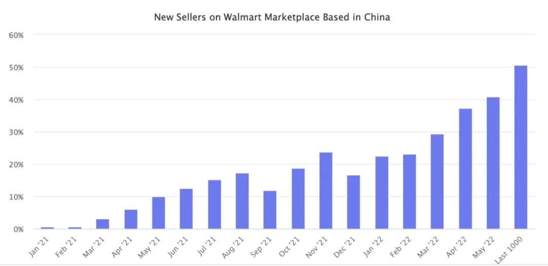 去年3月份,沃尔玛正式宣布向国际销售商开放市场之后,入驻沃尔玛的国际卖家数量开始迅速增加。 去年4月,中国卖家占沃尔玛全球所有新增卖家的比例仅为6%,到今年5月份,这一比例已经增长到51% 。