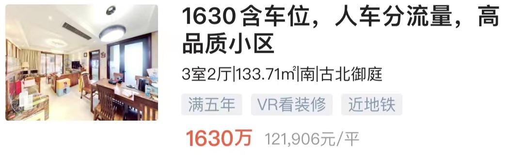 比如干挂大理石外墙的古北御庭,有套133㎡的高楼层三房挂牌1630万,单价在12万/㎡,仅比隔壁的万邦都市花园高了20%。