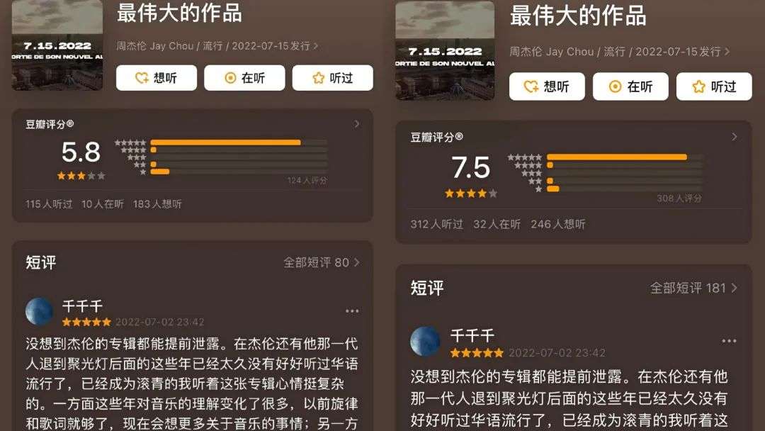 在舆论尚未爆发时,一位杰迷在专辑团购群里发了一张豆瓣5.8的评分截图,愤怒表示:“就离谱!新专辑还没发行,豆瓣就有了新歌乐评。”杰迷们自然不甘心偶像无辜被“黑”,自发团结去豆瓣反黑,打五星好评,以暴制暴,刷到了7.5分。最终,这场“闹剧”以豆瓣发布声明致歉并清空评分收尾。