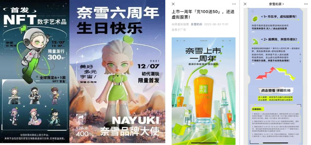 2021年12月奈雪的茶迎来六周年生日之际,借势元宇宙概念打造“美好多元宇宙”,官宣首位品牌大使NAYUKI,并正式发售了以NAYUKI为原型的1000个全球限量收藏级潮玩艺术品,同时也限量推出300份关于NAYUKI的NFT数字艺术作品,并以盲盒形式出售,邀请用户共同探索美好新维度,迈入美好多元宇宙。
