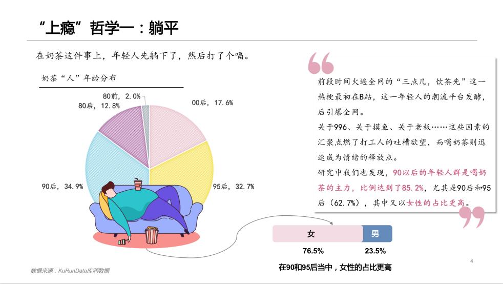 在库润数据《2021奶茶“上瘾”报告》中显示,90年以后的年轻人群是喝奶茶的主力,比例达到了85.2%,尤其是90及95后,占比达到62.7%,其中又以女性的占比更高(76.5%)。