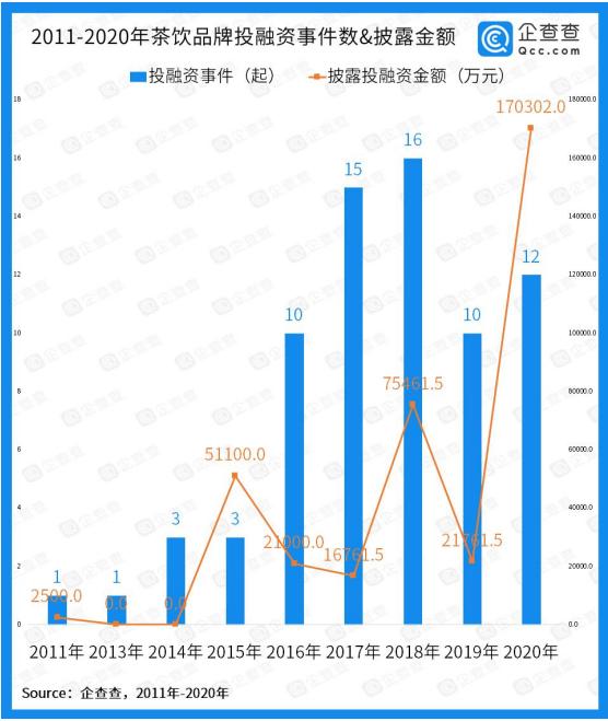 据企查查数据显示,从2016年到2020年,茶饮品牌投融资事件共63起,其中2020年就多达12起,披露金额超17亿元。