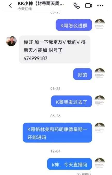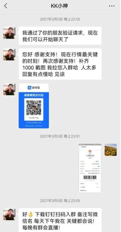 其实,粉丝们也不是没有发现猫腻。王方在花了4000元,跟着KK小神买了两次股票后,就发现事情不对劲了,“比自己炒股还亏得厉害。”当他找KK小神试图理论时,“不仅被踢出群,还被KK小神拉黑了。”