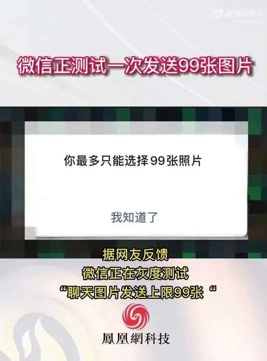 据@凤凰网科技 消息,微信正在灰度测试“聊天图片发送上限99张。”