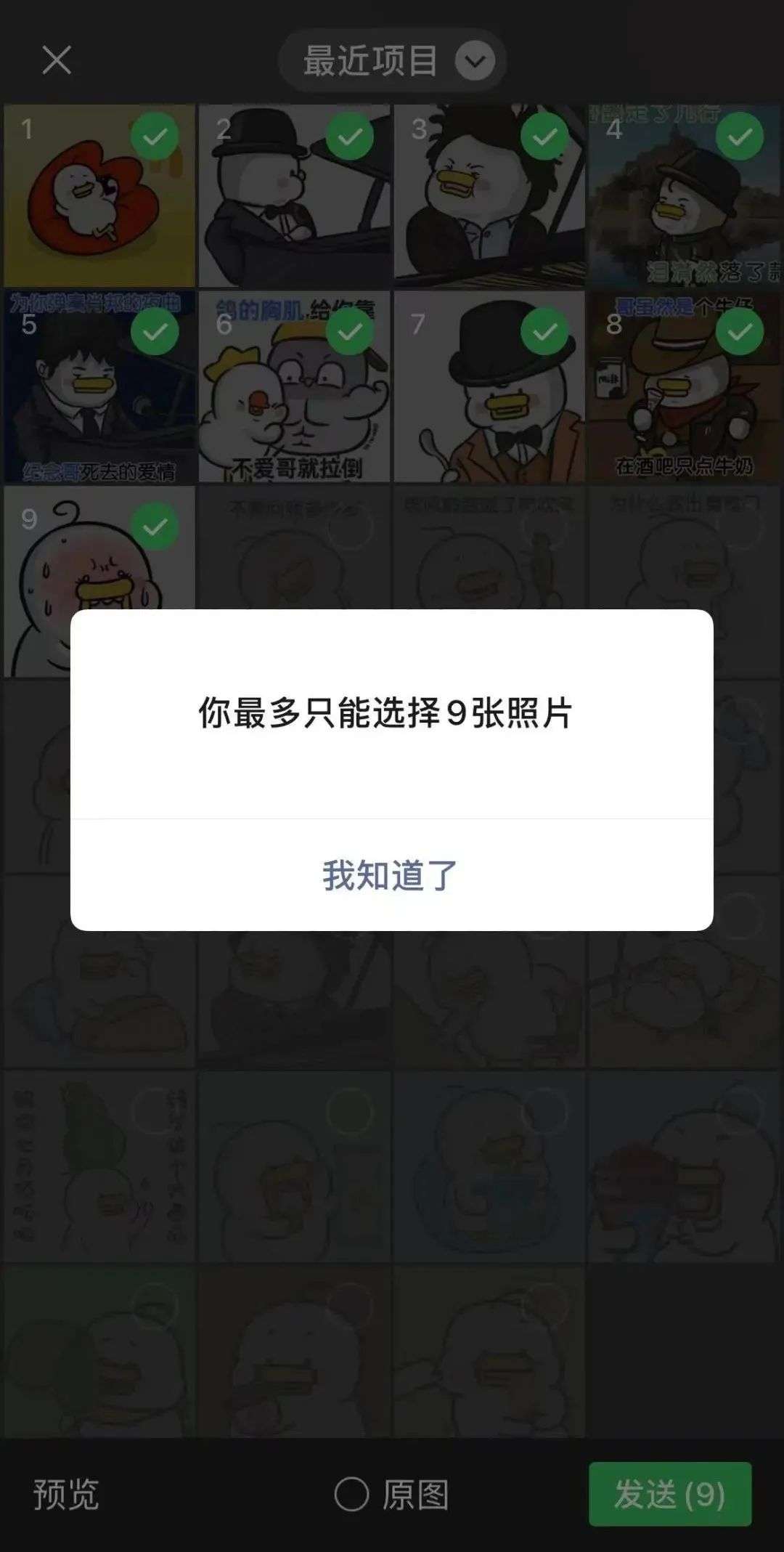 同一台设备,同一个微信App,不同账号发送显示的照片张数上限不同。