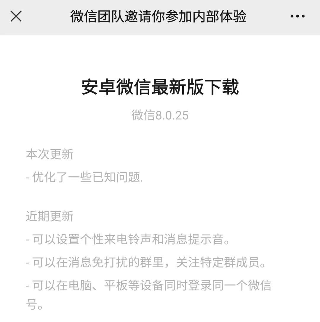 除了灰度测试的一次发送99张图片,微信安卓版最近也开始了新一轮的内测。