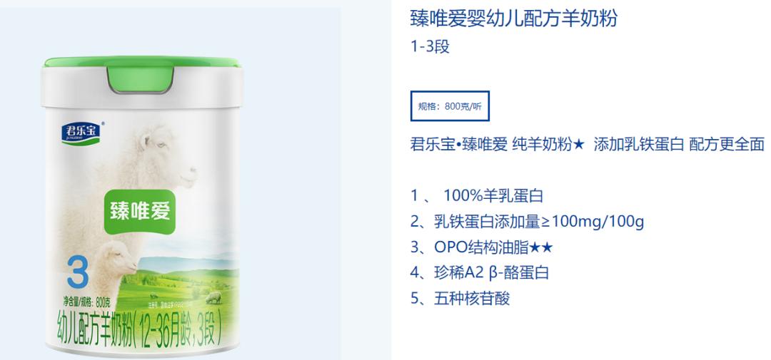从售价来看,君乐宝的纯羊奶粉甚至已经比肩飞鹤。京东商城数据显示,君乐宝臻唯爱3段幼儿配方羊奶粉(800g)价格为489元/罐,而飞鹤小羊秒可3段幼儿配方羊奶粉(830g)价格为418元/罐。