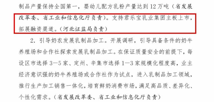 2019年4月,河北省奶业振兴工作领导小组发布的《2019年河北省奶业振兴工作方案》表示,“支持君乐宝乳业集团主板上市,拓展融资渠道”。