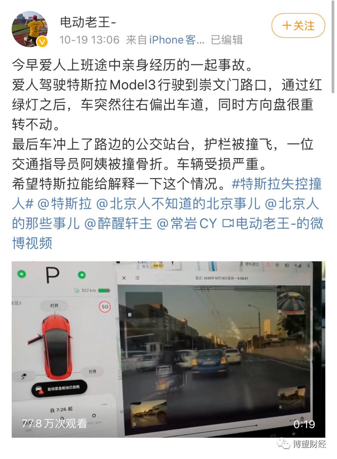 我们曾在《疯狂的电动爹》一文中报道过特斯拉事故,2020年10月19日,网名为电动车老王的特斯拉用户在微博上称,其妻子在驾驶特斯拉Model3时,因方向盘很重无法旋转,致使汽车撞向公交站台,一阿姨被撞伤。