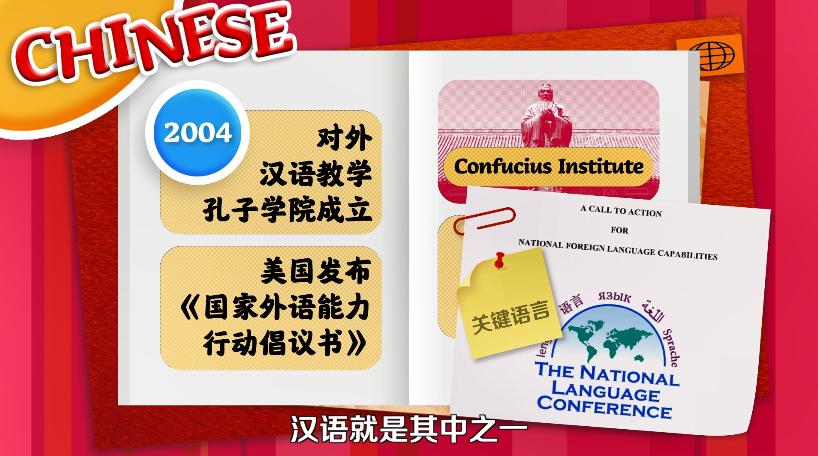 英语对中国来说是这样,汉语对世界来说也是一样,以对外汉语教学为主旨的孔子学院是在2004年成立,同一年,美国发布《国家外语能力行动倡议书》,号召公民学习美国需要的 “关键语言”,汉语就是其中之一。
