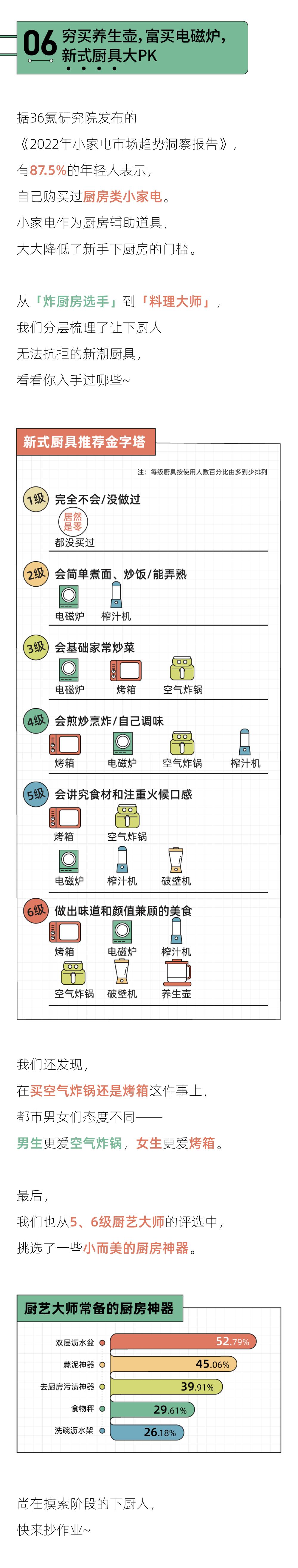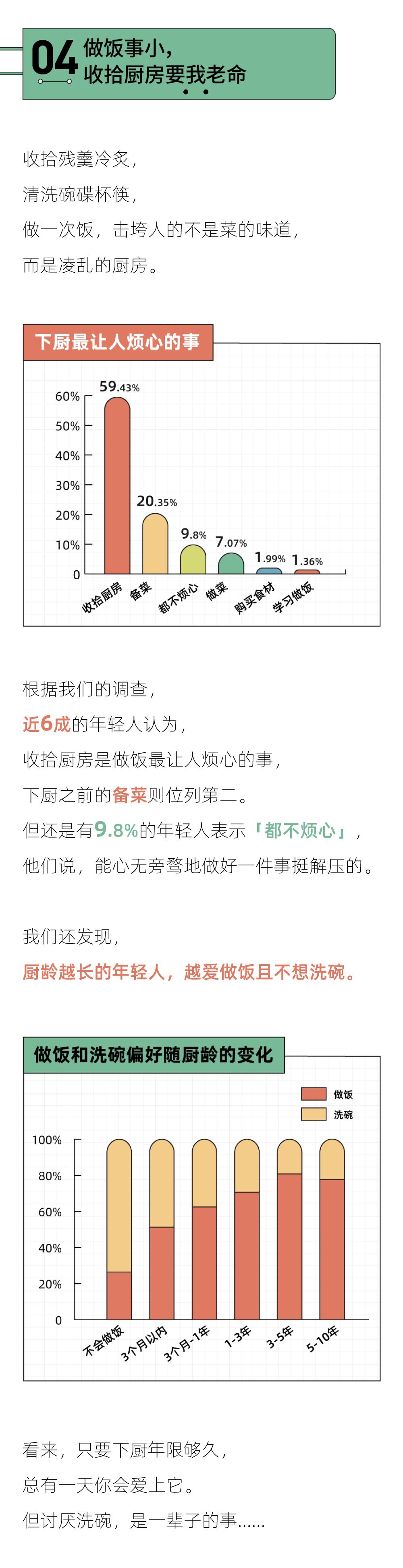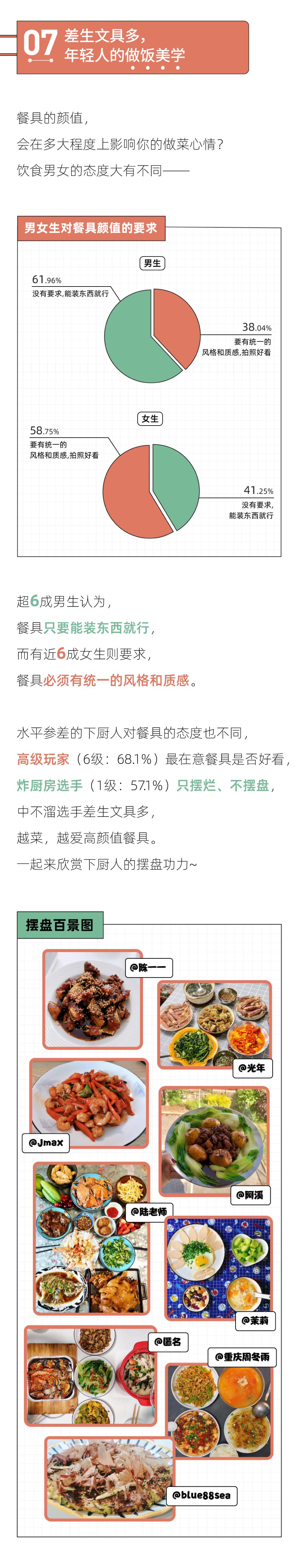 5、男生超过女生成为厨房主力军:7成女生要求另一半会做饭,而不到5成男生对另一半有同样的要求。越来越多男生涌入厨房,男女家庭职责或许会迎来一次调转?