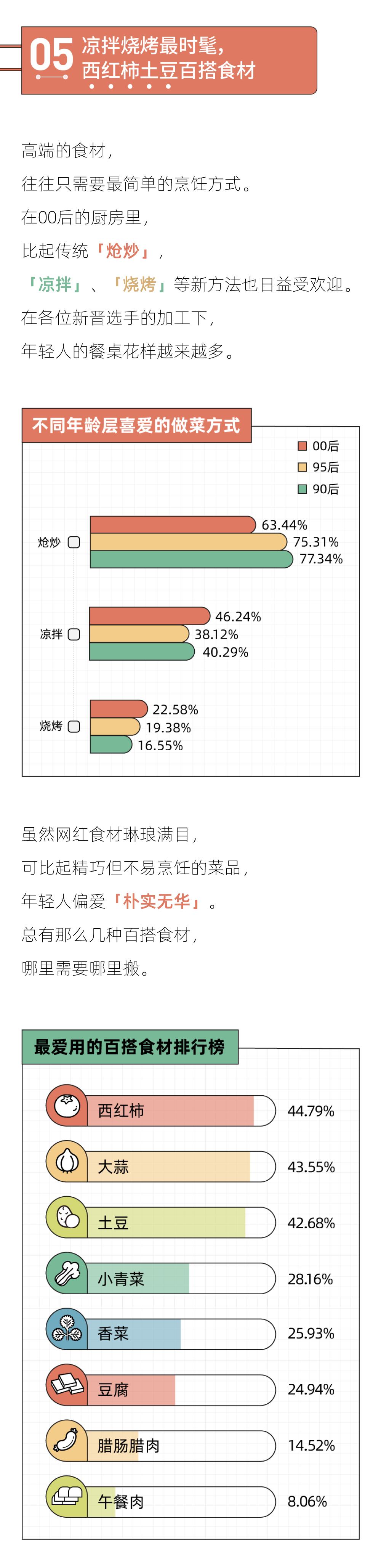 3、烹饪方式多元,凉拌烧烤崛起:虽然炝炒仍是最主流的方式,炖煮、蒸煮、凉拌、烧烤等简单烹饪方式也在年轻人中流行了起来,越是年轻,越爱烧烤凉拌。
