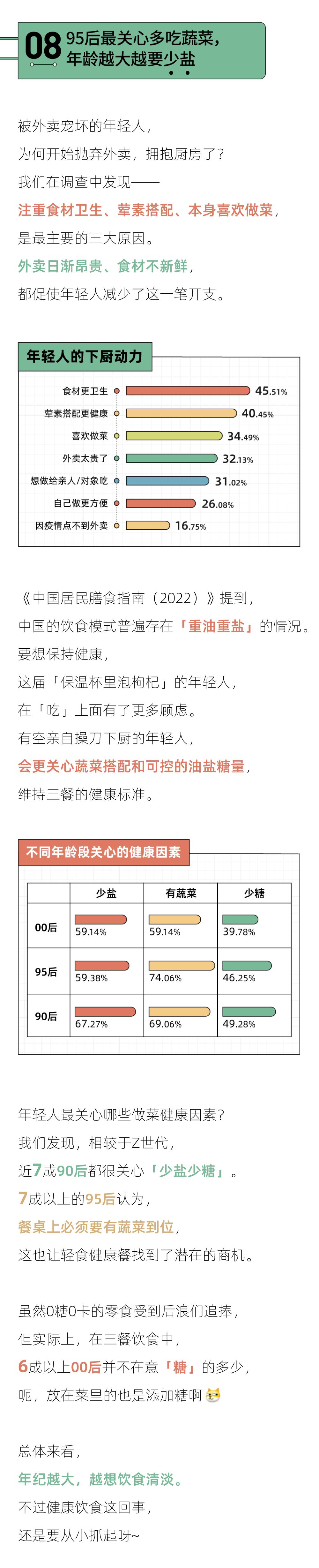 4、蔬菜为王:食材卫生和荤素搭配,是很多人选择自己做饭的主要理由。95后、00后普遍公认,每餐都要搭配蔬菜是做菜时最重视的因素。