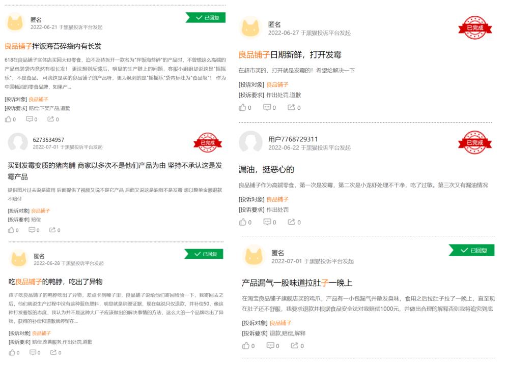 以公司所言的高品质产品为例,据创始人杨红春在与投资者交流中表示,截至2022年公司已拥有超过1500款产品,产品全部采用定制化与非定制化代工厂采购的模式。虽然公司声称制定了严苛的产品质量标准书,建立了自己的产品检测中心,通过了国家级实验室(CNAS)认证,覆盖产品入库到上市销售后的全部环节。但是,如果细看用户体验,显然良品铺子还需要做得更多,在黑猫投诉当中,良品铺子一共收到了1532条投诉,其中,食品过期、漏油、发霉等问题屡见不鲜。而且翻看投诉,其中很高比例发生时间为2022年。