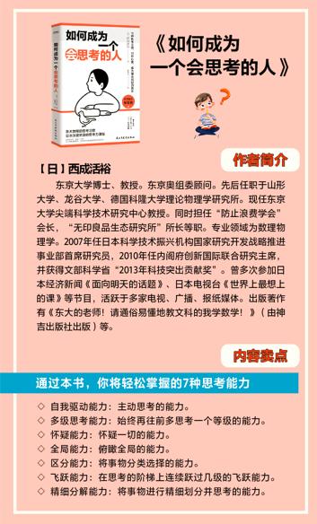 在这里,再向大家推荐一本思考方面的书,叫《如何成为一个会思考的人》。作者西成活裕是东京大学博士,东京奥组委顾问。先后任职于山形大学、龙谷大学、德国科隆大学理论物理学研究所。现任东京大学尖端科学技术研究中心教授。