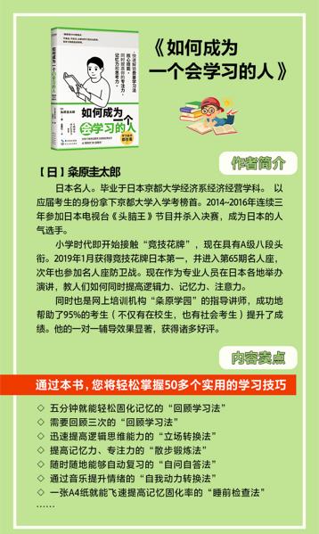 到目前为止,他教过的95%的学生从四年级的小学生到五十几岁的成年人,都实现了成绩的提升。后来,他将自己的学习方法写成一本书《如何成为一个会学习的人》,在这本书中,他把平时传授给学生们的方法,整理成一套人人可以自学的知识体系。